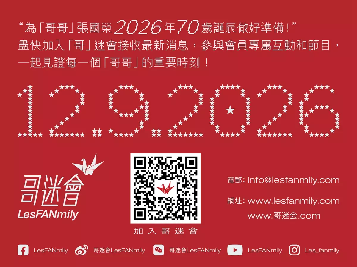時光流轉,2026年9月12日即將迎來「哥哥」70歲誕辰,許多「哥」迷早於去年已向陳太表達心願,希望舉辦紀念活動,其中最受期待的,包括設立一座永久的張國榮紀念館、為「哥哥」鑄立銅像,以及舉行大型紀念活動等。陳太已依據「哥」迷們的建議積極籌備。為凝聚更多「哥」迷共同參與,並呼籲大家盡早加入「哥」迷會,以及時接收最新消息,參與會員專屬互動,一起見證每一個屬於「哥哥」的重要時刻!