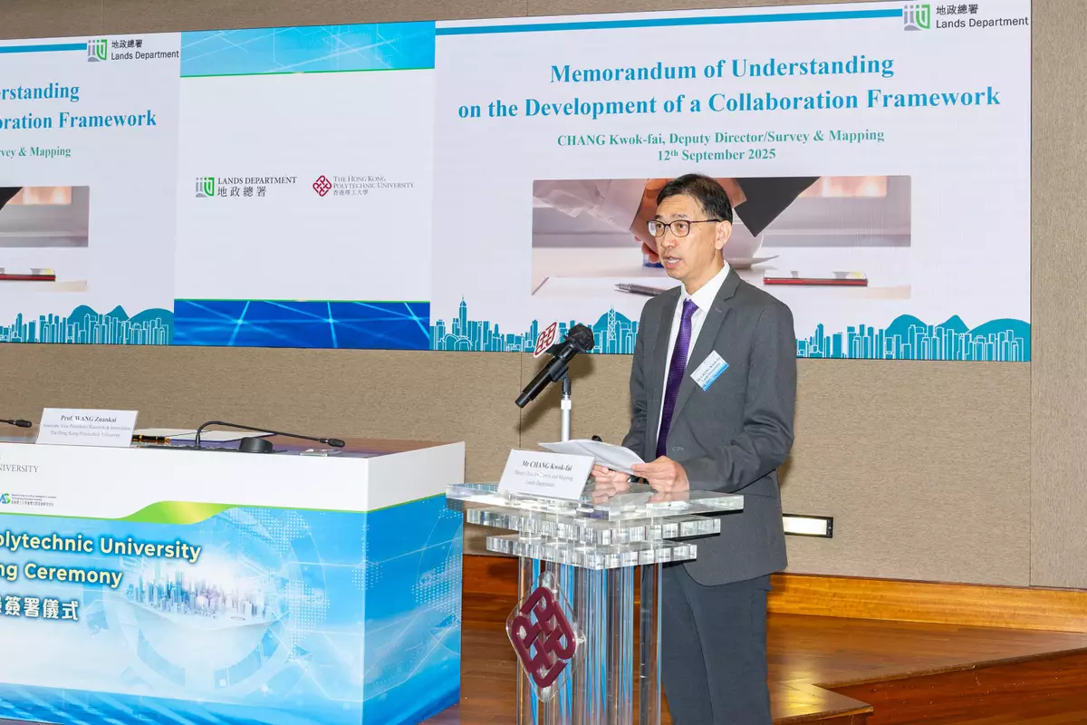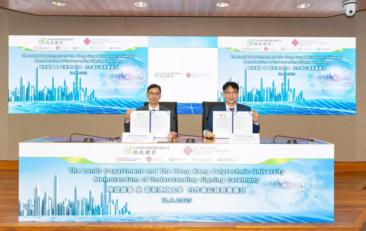 合作備忘錄由地政總署副署長(測繪事務)張國輝和理大協理副校長(研究及創新)王鑽開教授簽署。合作內容涵蓋研發測量及地理空間技術、提升衛星定位基礎設施、應用人工智能開發創新地理空間解決方案,以及推動專業培訓。雙方將設立聯合研究中心,透過科研及教育活動促進學術界、業界及政府的交流與協作。