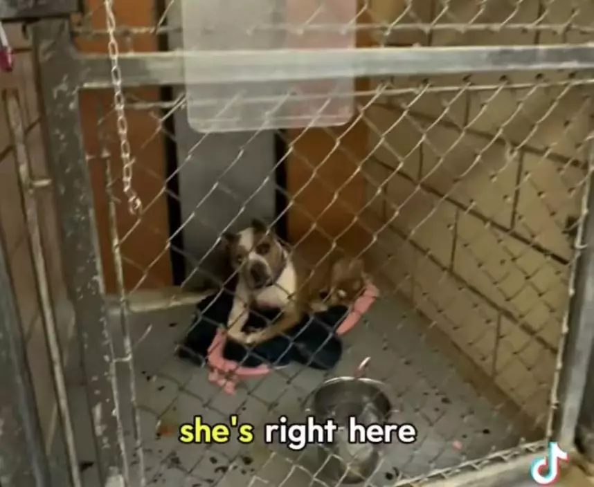 收容所「彩虹眼」狗狗兩度有家又被退養落寞躲籠內。影片截圖