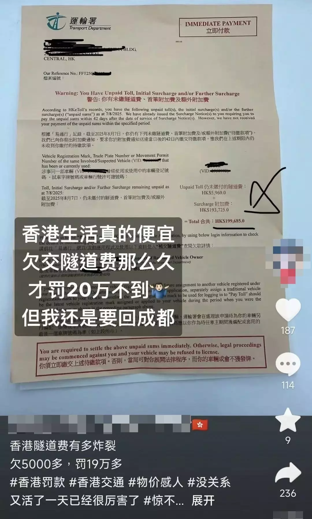 一名男子在社交平台發文,指在港欠交隧道費近6000元,被罰款逾19.3萬元,表示會不付款返回內地。運輸署回應指「易通行」自實施以來,只有於1%車主在多番提醒後仍未繳交隧道費。