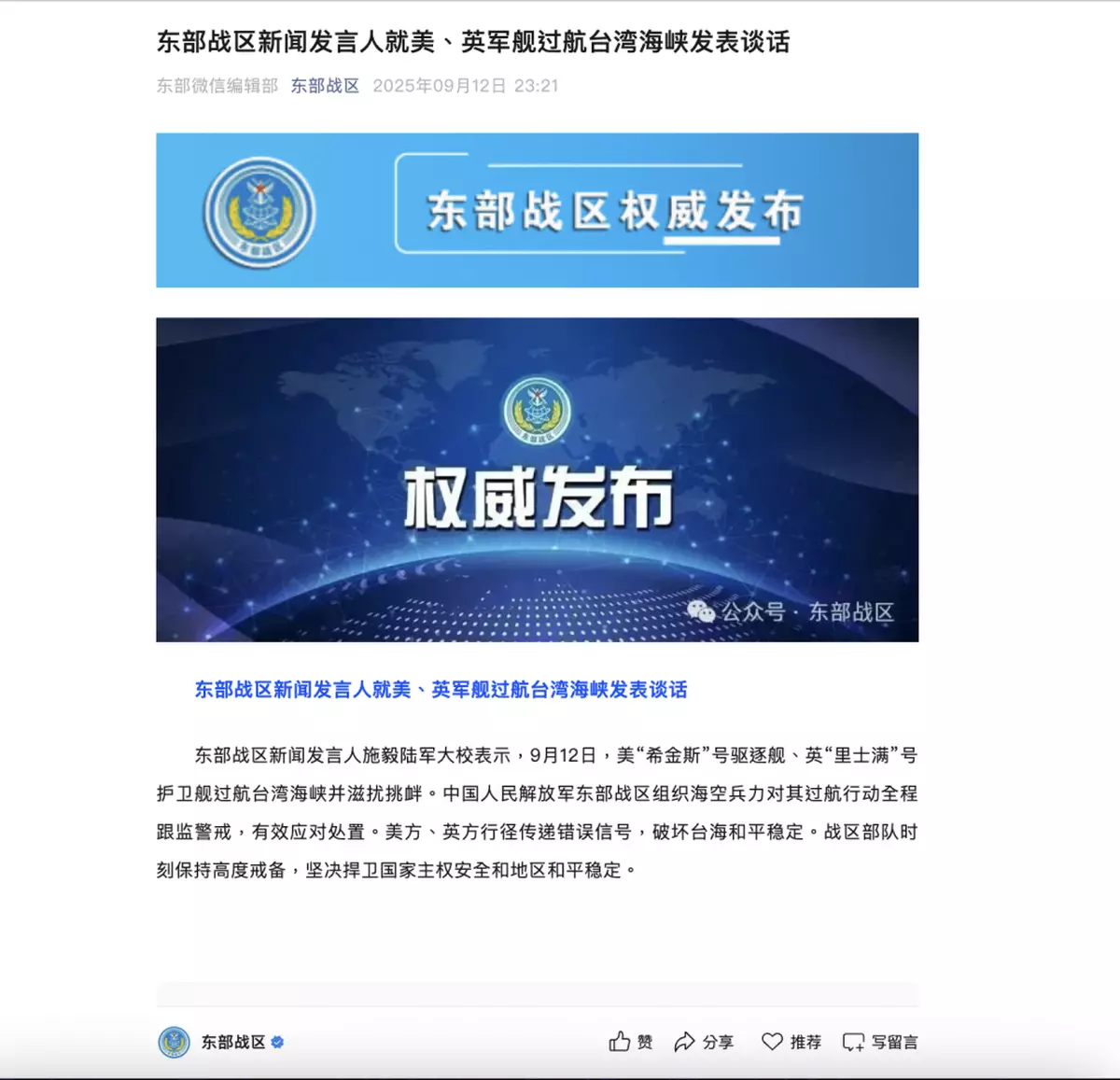 發言人表示,美方和英方的行徑傳遞錯誤信號,破壞台海和平穩定,戰區部隊時刻保持高度戒備,堅決捍衛國家主權安全與地區和平穩定。