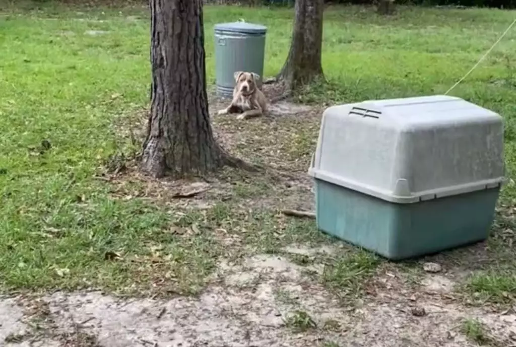 美國夫婦睇屋驚見10歲比特犬遭棄養綁後院樹旁備感心碎,遂果斷買屋收養成新主人。