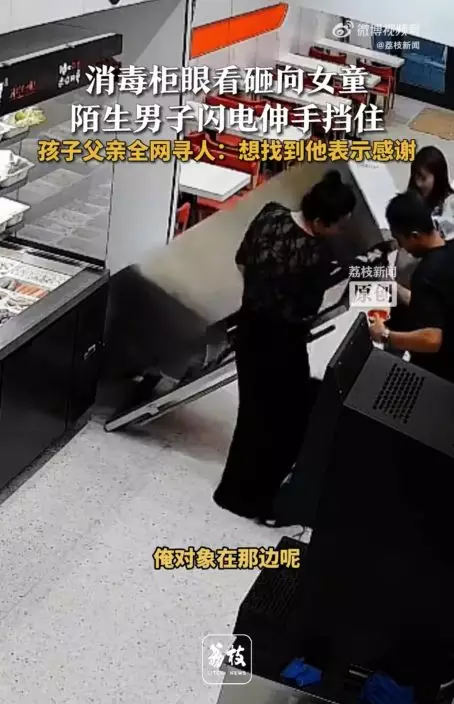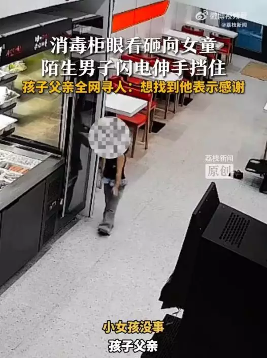 綜合內媒報道,山東棗莊一名幼童日前在餐廳內調皮拉動消毒櫃,導致櫃體突然傾倒險壓住女童,危急關頭所幸站在一旁一名陌生男子眼疾手快,迅速伸手將櫃體擋住,避免悲劇發生。事件曝光後引發網民熱議,女童家屬隨即展開「全網尋人」,並於9月11日成功找到救人者,當面致謝並送上錦旗。