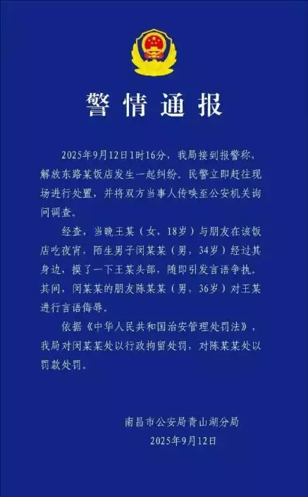 王女報警後,警方迅速趕抵現場到場將雙方帶回派出所調查。同日,警方通報對閔某處以行政拘留處罰,並對辱罵女子的陳某處以罰款處分。