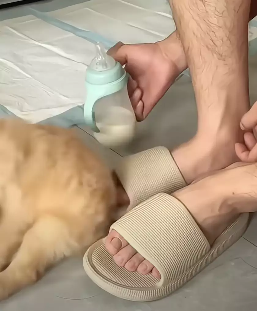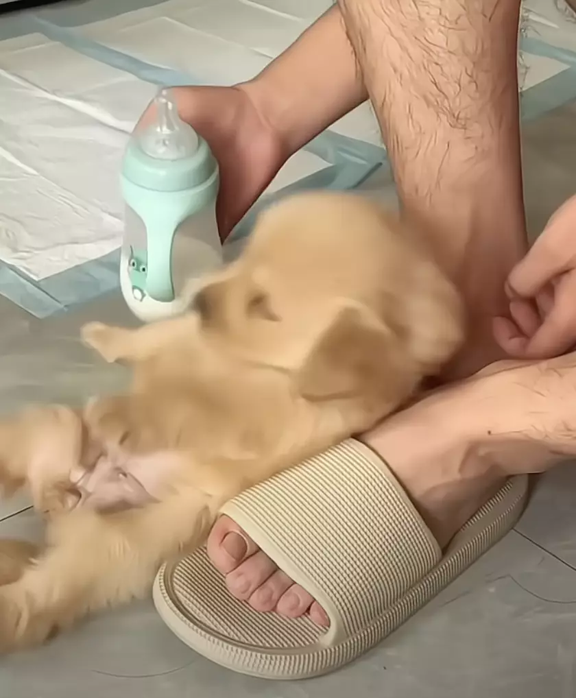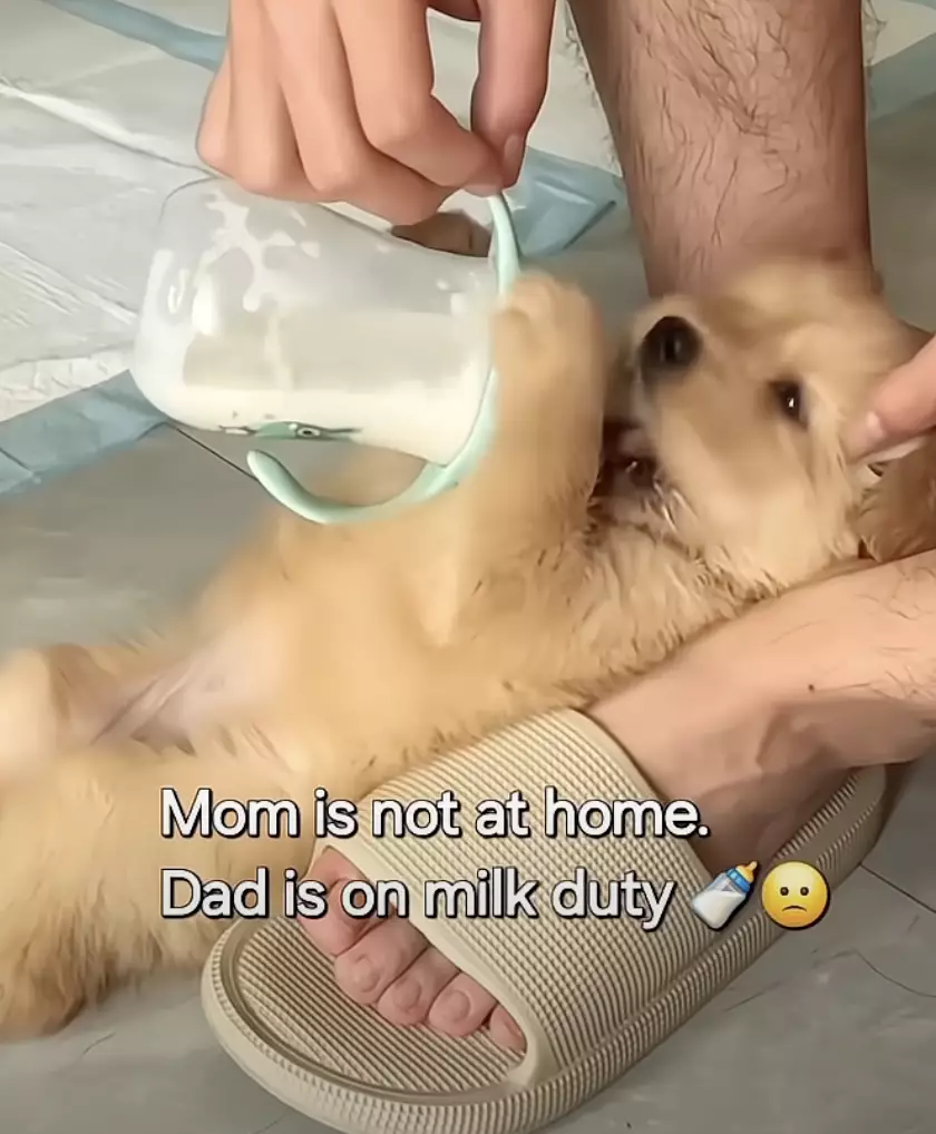 國外有一對夫妻養了一隻小金毛,由於年紀尚小需要餵奶,平時都是由女飼主抱在懷裡餵的,但某天她外出,只能讓老公來當臨時奶爸。