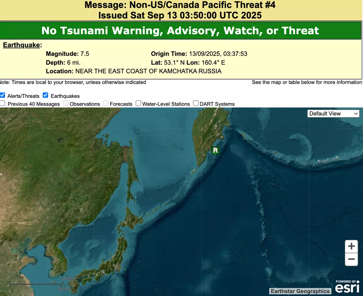 俄羅斯堪察加半島附近海域發生7.5級地震,位於夏威夷的美國太平洋海嘯預警中心表示,地震並無引發海嘯。中國自然資源部海嘯預警中心亦表示,這次地震不會對中國沿岸造成影響。