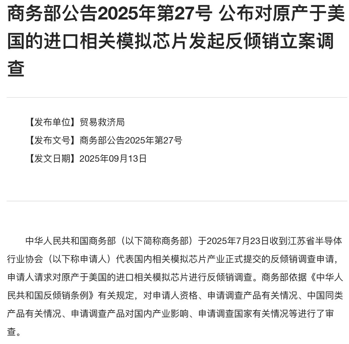 中國商務部宣布,對原產於美國的進口相關模擬芯片發起反傾銷立案調查。