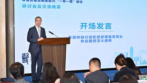 林定國昨日下午出席由律政司主辦、新疆律師協會承辦的香港普通法制度助力「一帶一路」建設研討會及交流晚宴,與會者包括新疆的企業和法律界代表。研討會期間,律政司與新疆維吾爾自治區司法廳簽訂法律服務合作框架協議。根據協議,兩地法律部門支持新港法律業界加強交流及業務合作;而香港大律師公會亦與新疆律師協會簽訂合作備忘錄,加強新疆律師與香港大律師的合作,促進新港兩地法律專業進一步交流和專業協作。