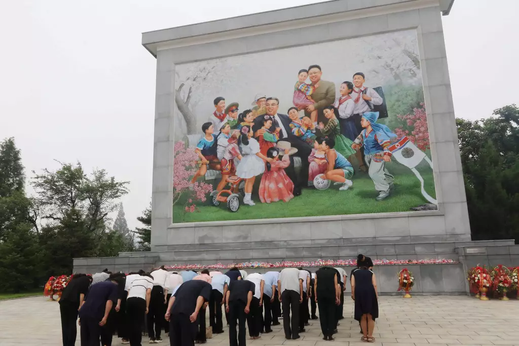民眾向北韓已故領袖金日成和金正日畫像躹躬。AP圖片