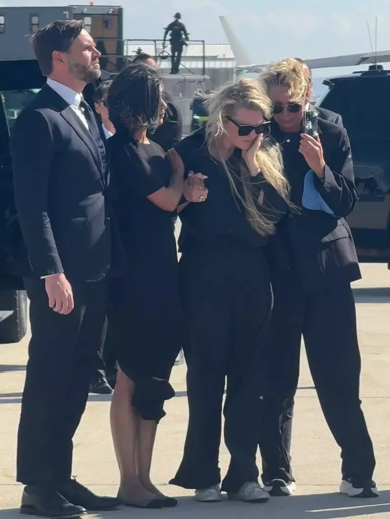 查理柯克的遺孀埃里卡(Erika Kirk)在副總統萬斯斯夫妻陪同下,搭乘空軍二號把丈夫遺體送回家鄉。AP圖片