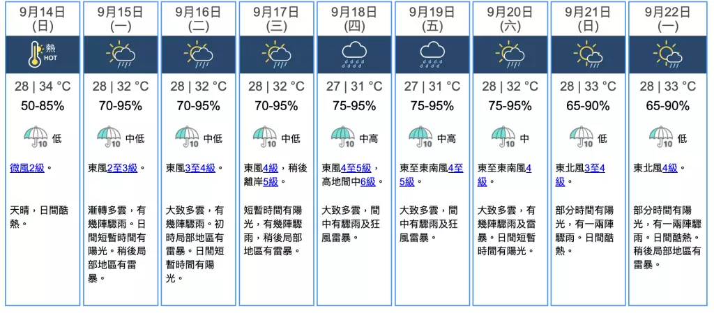 香港天文台表示,副熱帶高壓脊正為廣東帶來普遍晴朗的天氣。本港地區星期日天晴,日間酷熱,市區最高氣溫約34度,新界再高一兩度。吹微風。