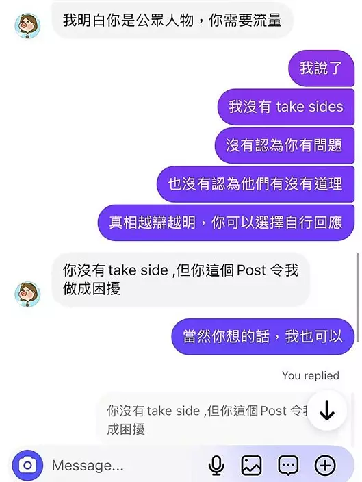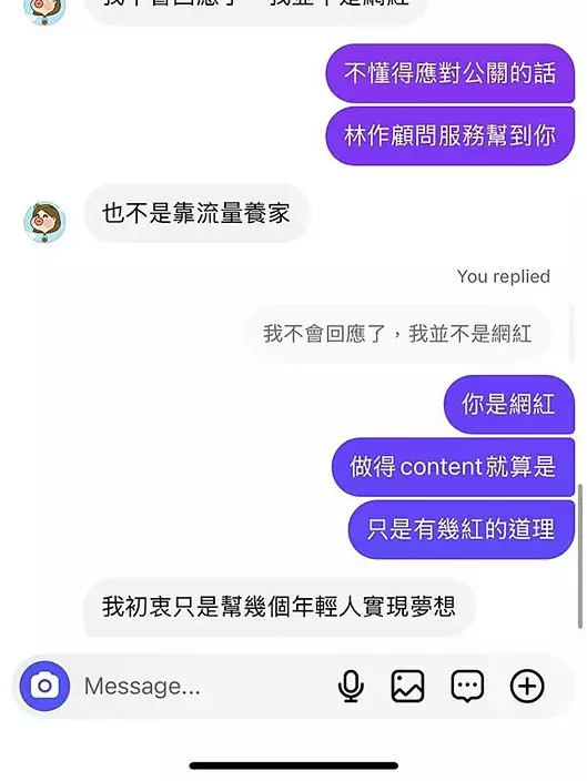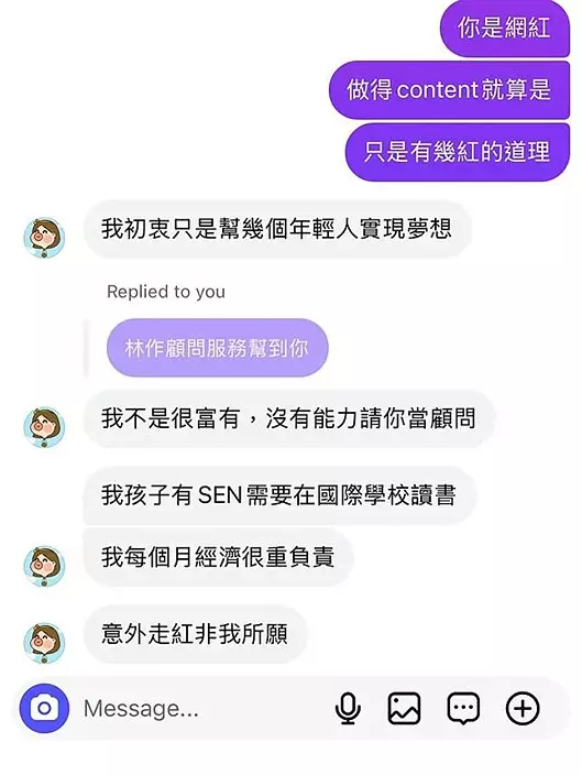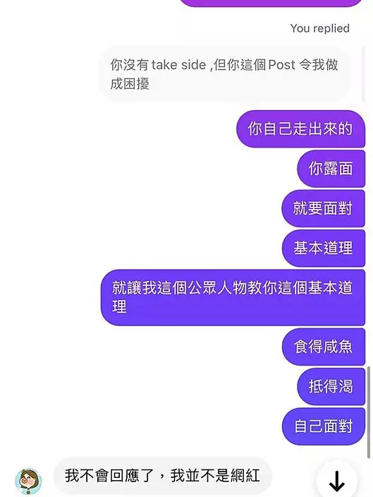 不過林作並不買帳,直斥:「你四處接受訪問,你話唔係自願?出得嚟就要食得鹹魚抵得渴,呢個就係出名嘅代價。有種你就delete你IG?我100%肯定你唔會。」