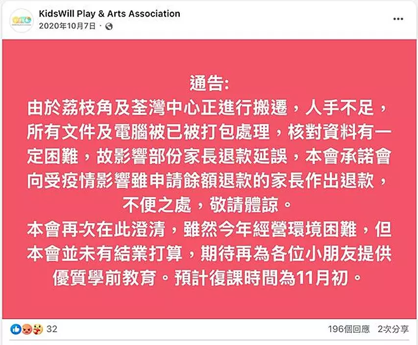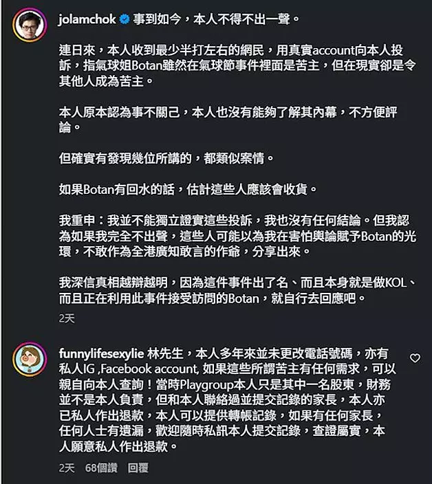 Botan其後在社交平台火速回應,強調自己只是Playgroup股東,財務並非她管理,已經有家長透過她取回退款,而且她願意提供轉帳紀錄,若有人遺漏,隨時可以私訊她查證:「查證屬實,本人願意私人作出退款。」