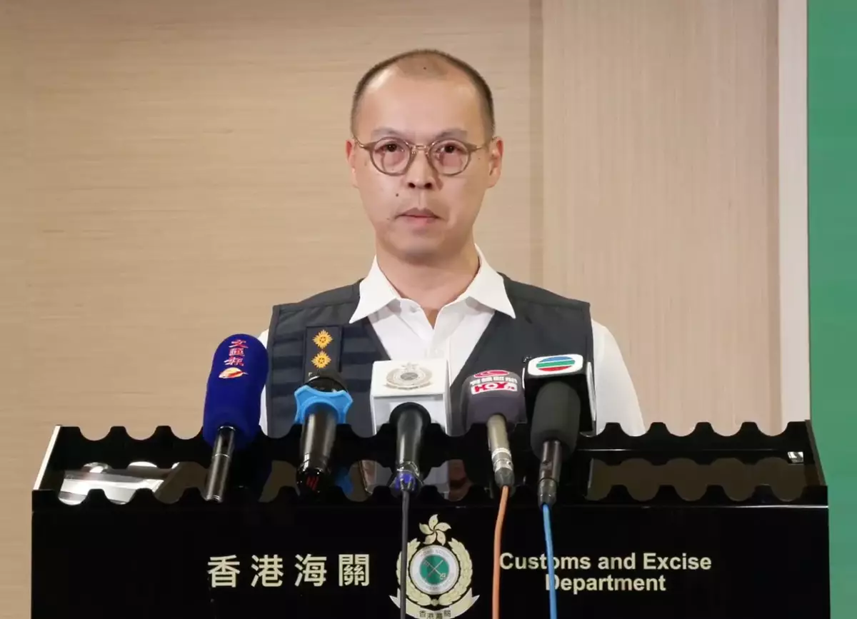 海關毒品調查科機場調查課高級調查主任何健麟向傳媒講述案件詳情。香港海關FB
