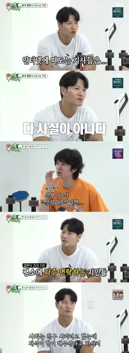 金希澈半開玩笑地問為何未受邀參加婚禮,金鍾國笑答:「如果規模大一點,肯定會邀請你!」他還提到,徐章勳因頻繁聯絡而受邀,而東燁哥則是母親特別要求邀請的《我家的熊孩子》代表人物。金希澈好奇追問金鍾國的妻子是否為「洛杉磯出身」或「英語講師的女兒」,金鍾國果斷否認:「這些都不是事實,完全不是!」他強調,妻子與自己喜愛的運動無關,甚至「完全不運動」,打破了外界對其配偶的諸多猜測。當被問及介紹妻子給父母的感受時,金鍾國簡單表示:「他們很喜歡吧。」展現低調的幸福。金東賢則建議金鍾國求婚時應更用心,稱「若沒特別的求婚,會有些遺憾」。金鍾國則笑言,自己的爭執多與運動有關,而妻子對運動的冷淡態度,讓他感到婚姻生活的平衡與有趣。