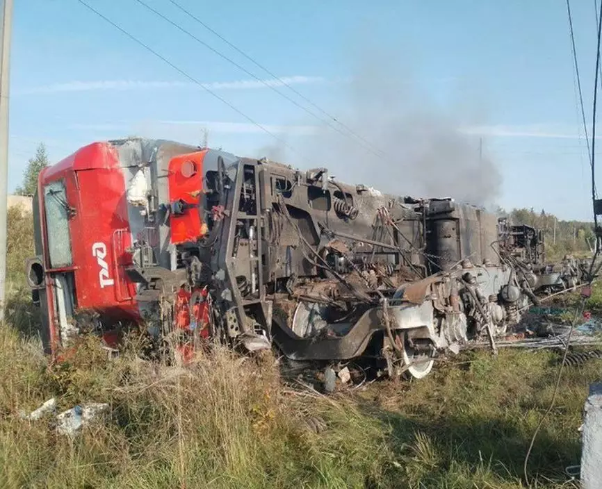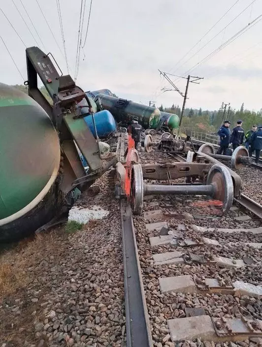 聖彼得堡至普斯科夫的鐵路線發生爆炸,導致一列火車機車脫軌,15節油罐車被毀。X圖片