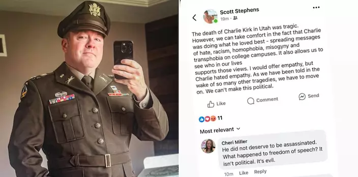 媒體報道,美國陸軍上校斯科特·斯蒂芬斯(Scott Stephens)最近就遭遇了停職。他在社交媒體上評論柯克之死時寫道:柯克在大學校園裡長期傳播仇恨和歧視言論,如今遇害固然悲慘,但不應讓這件事再被政治化。