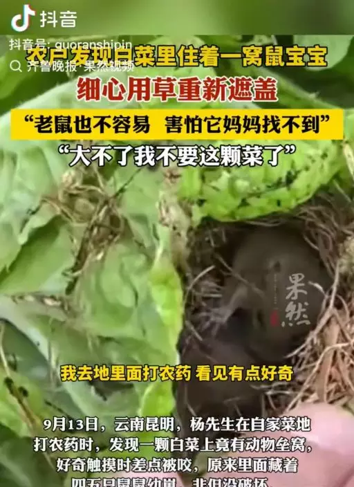 影片曝光後,不少網民留言大讚楊先生暖心,「農夫好暖心」、「鼠寶寶太幸運了」、「這應該是世界上最安全的一顆白菜」,也有人打趣說「白菜:我不僅是蔬菜,還是鼠鼠的產房」。