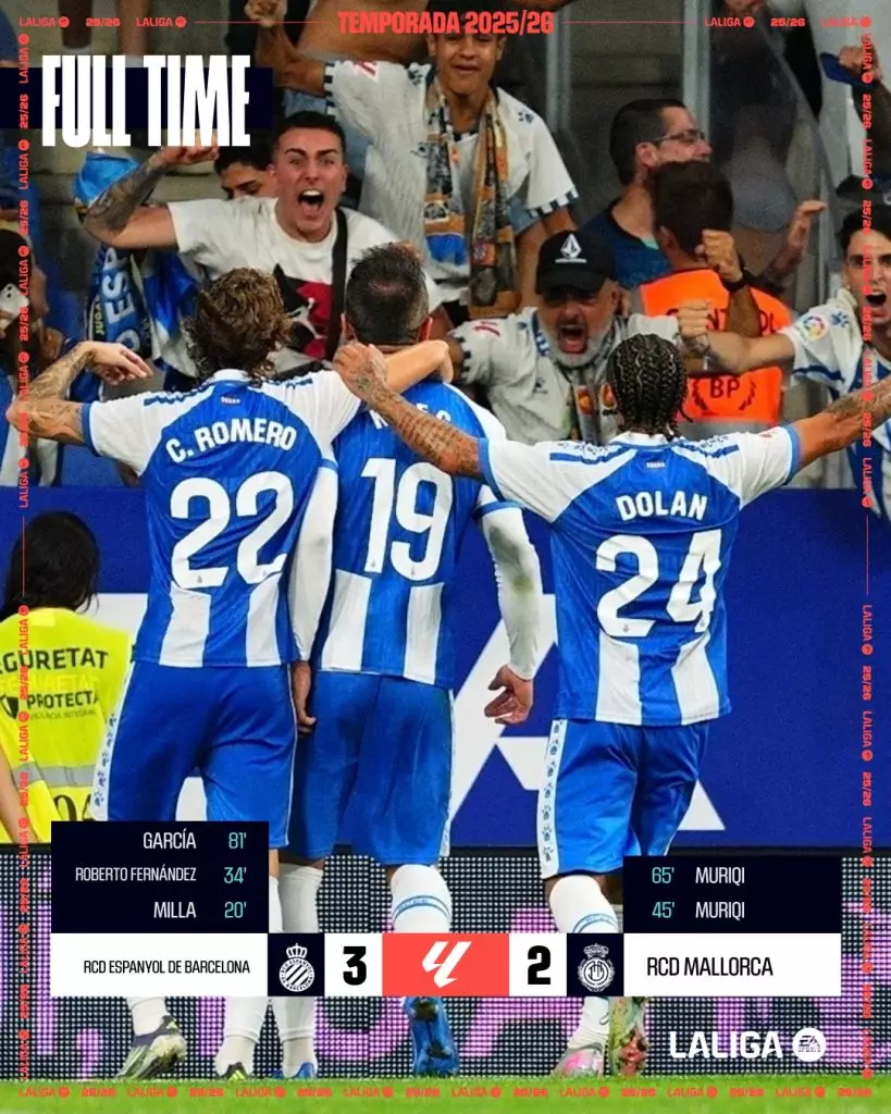 西班牙甲組聯賽,愛斯賓奴主場3:2擊敗馬略卡。FB圖片@LaLiga