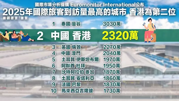香港登上世界旅客到訪量全球第2位。
