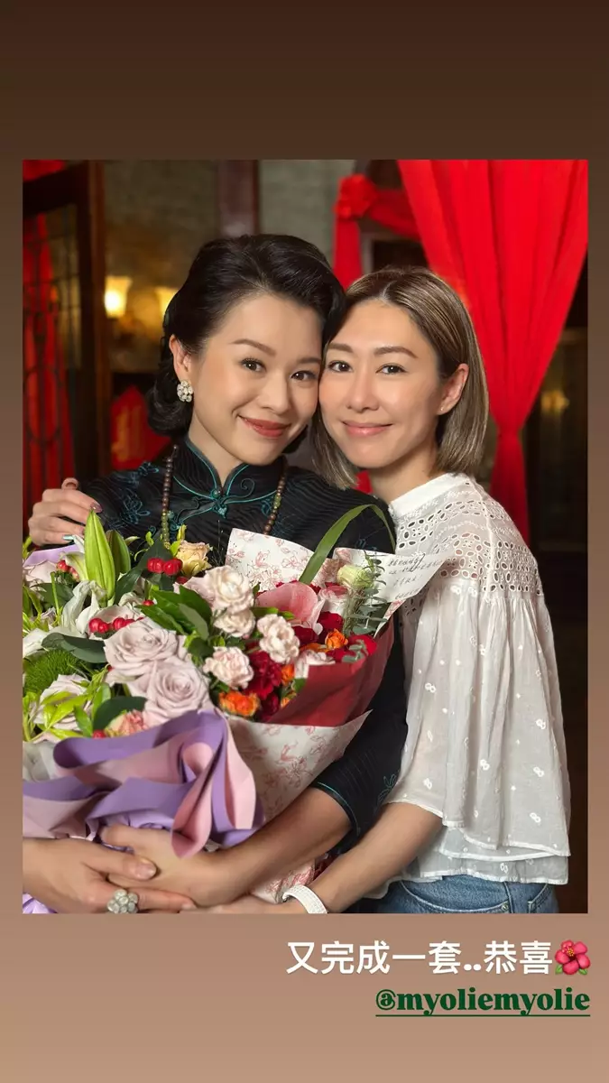 更等到胡杏兒殺青,並為好姊妹送上鮮花慶祝。