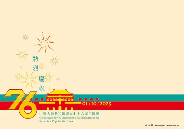 「熱烈慶祝中華人民共和國成立七十六周年國慶」紀念封。澳門政府新聞局圖片