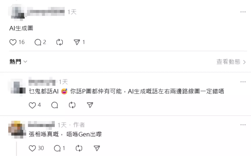 由於場面實在誇張,令一些網民質疑相片是否是人工智能(AI)所生成,但樓主回應「張相喺真嘅, 唔喺Gen出嚟」,有網民亦留言撐到「乜鬼都話AI,你話P圖都仲有可能,AI生成嘅話左右兩邊路線圖一定錯哂」。另有人就質疑左方玻璃車門外的廣告「張相九成九係AI整出來」,但有網民就認得此圖的確是一間保險公司於港鐵發放的廣告。