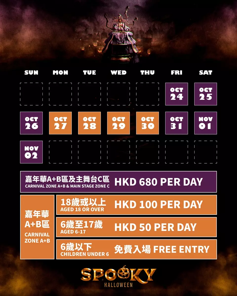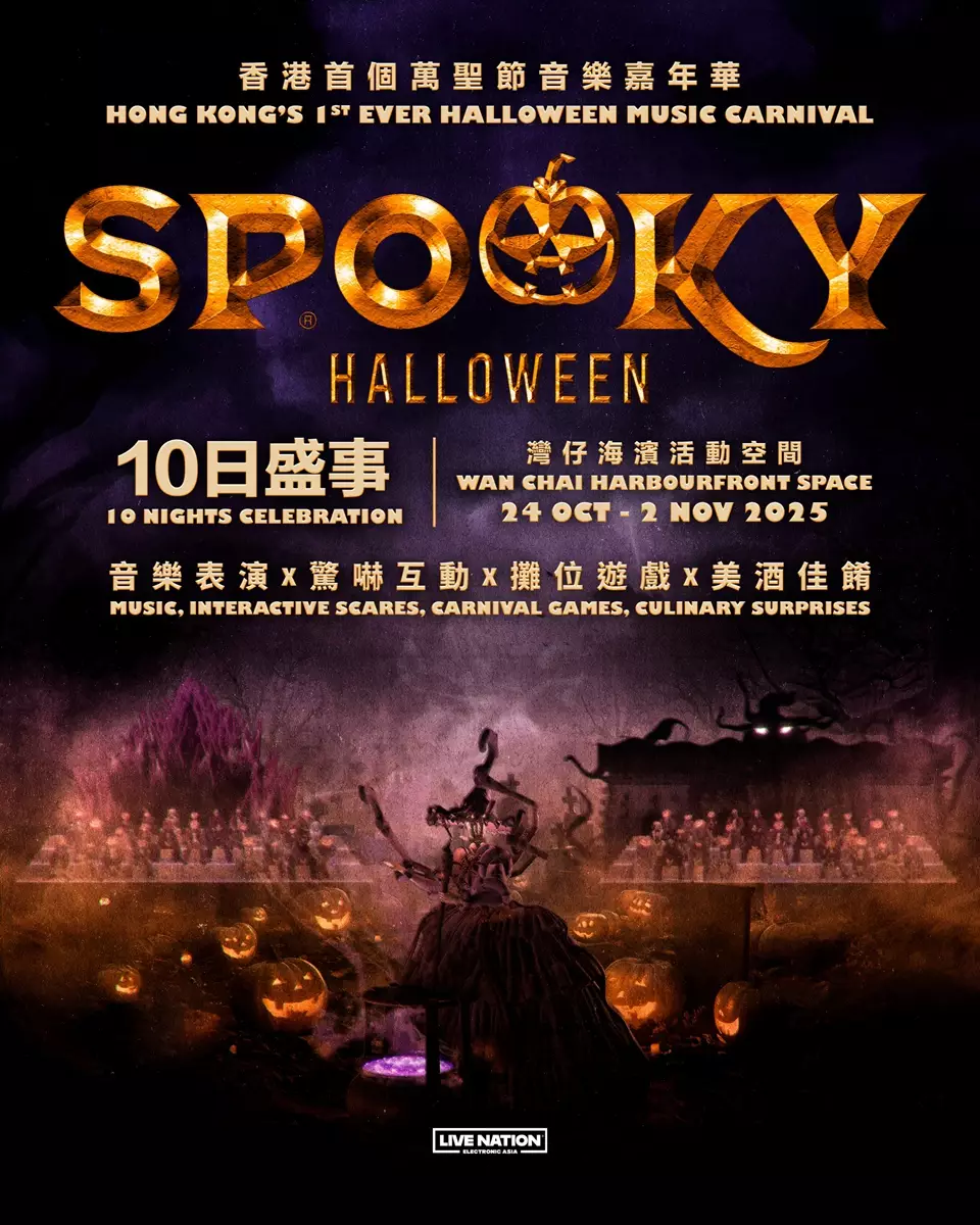 《SPOOKY Halloween》不只是一個音樂節,更是一場屬於整座城市的變裝狂歡。從10月24日至11月2日,灣仔海濱將化身為逾萬平方米的奇幻樂園,分為三大主題區域:「主舞台音樂派對」、「詭趣市集嘉年華」及「怪奇藝術區」。無論您是追求心跳加速的音樂迷、與好友結伴尋找驚喜的派對動物、或是盛裝打扮成經典萬聖節角色的打卡族,只需走進《SPOOKY Halloween》,您將踏入萬聖節的全新領域,探索這個充滿音樂、藝術與驚喜的奇幻世界!