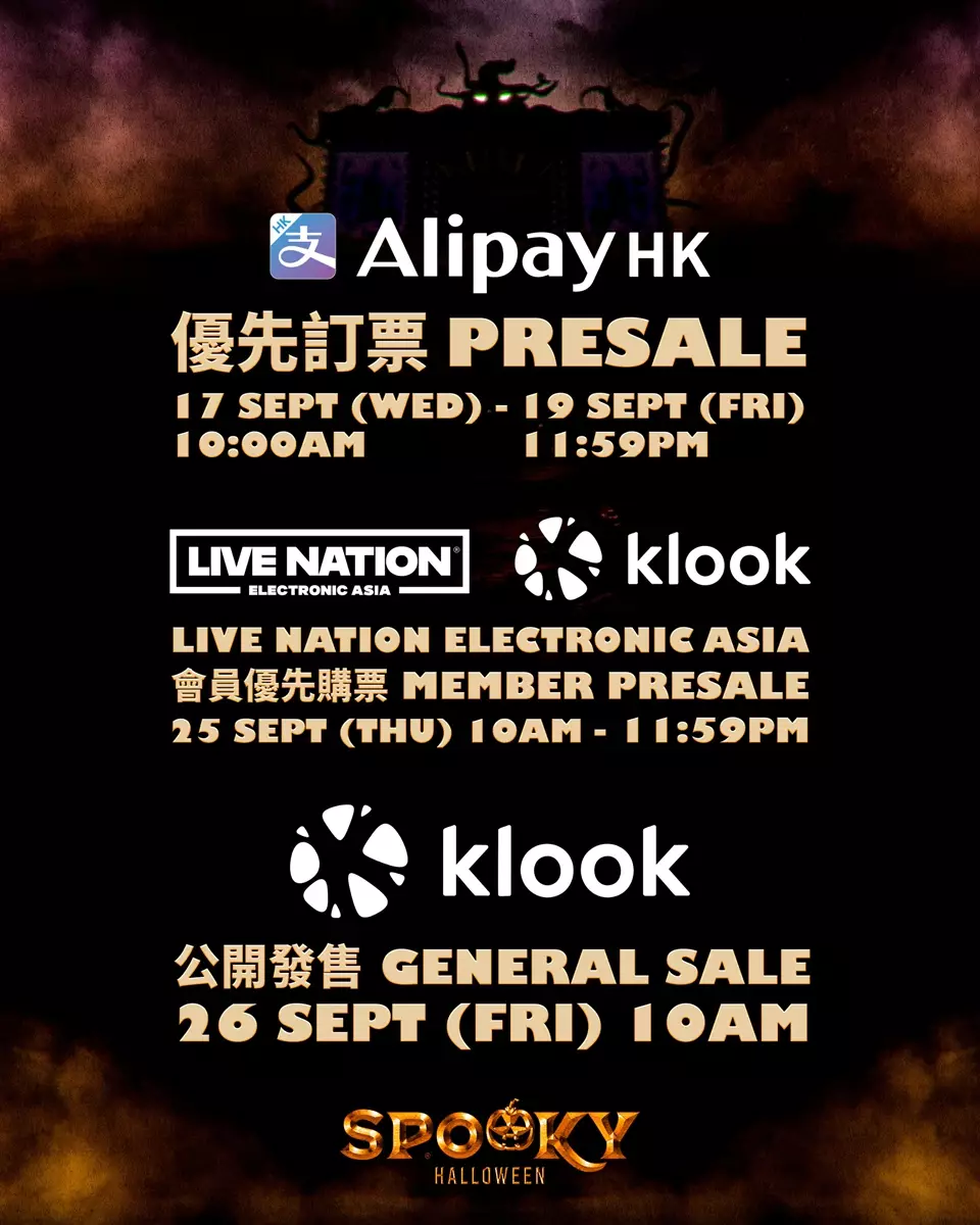 AlipayHK將於9月17日(星期三)上午10時至9月19日(星期五)下午11時59分舉行優先訂票。Live Nation Electronic Asia會員,則可於9月25日(星期四)上午10時至下午11時59分,尊享klook優先購票;並將於9月26日(星期五),上午10時開始,於klook公開發售。
