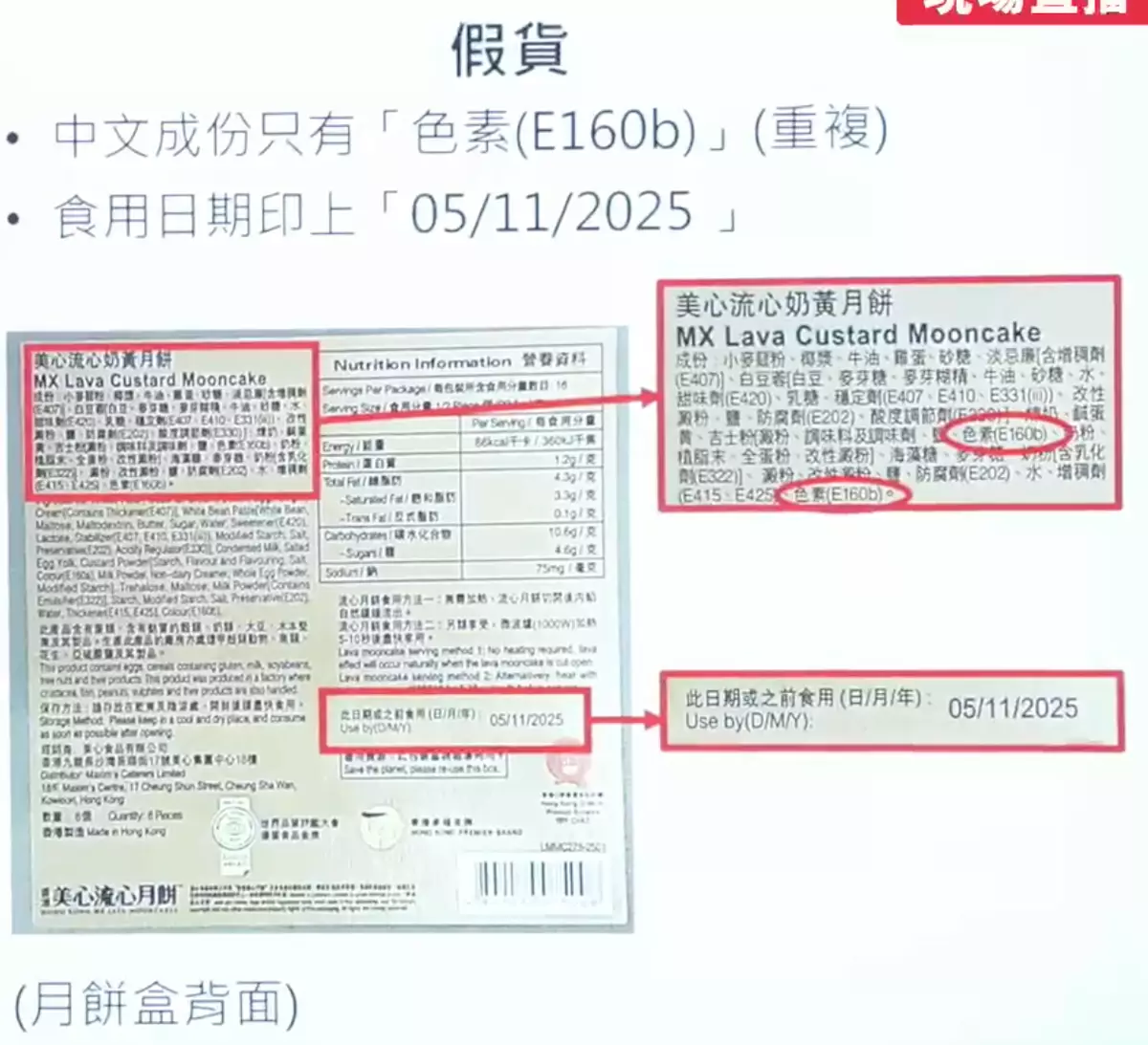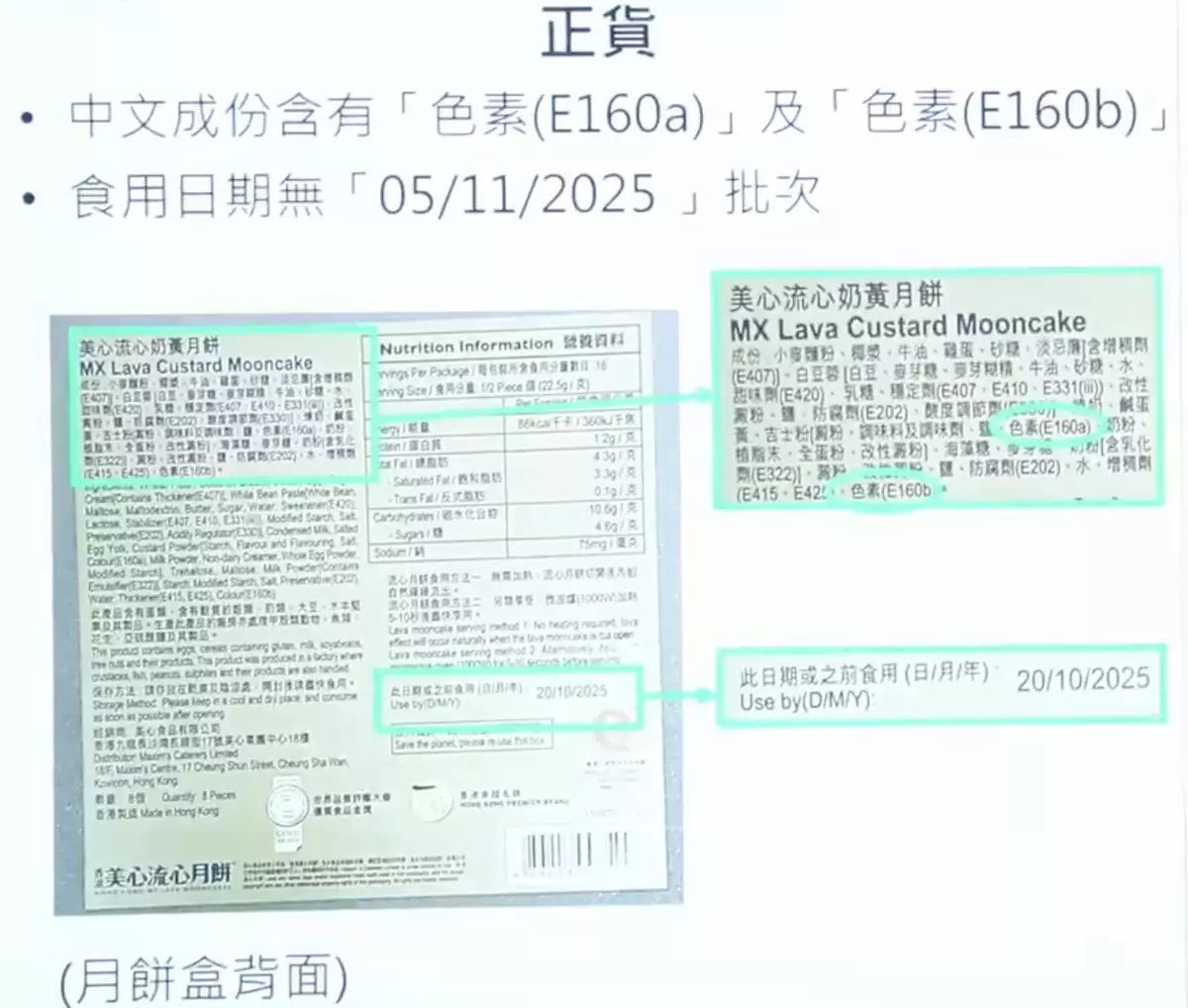 何說,海關留意到該批懷疑冒牌月餅,包裝盒外表模擬度頗高,售價約正貨價的八成左右,市民難以單憑包裝盒外表辨別真假。 然而,不法份子要顧及製作成本,故仍然有一些細節處理得比較粗疏,例如月餅盒背面列出的成份和工貨有所不同,正貨的中文成份含有色素E160s及色素E160b,而冒牌貨的中文成份只是重覆印上色素E160b。 另外食用日期方面,正貨並無2025年11月5日批次,而冒牌貨方面食用日期是印上2025年11月5日。