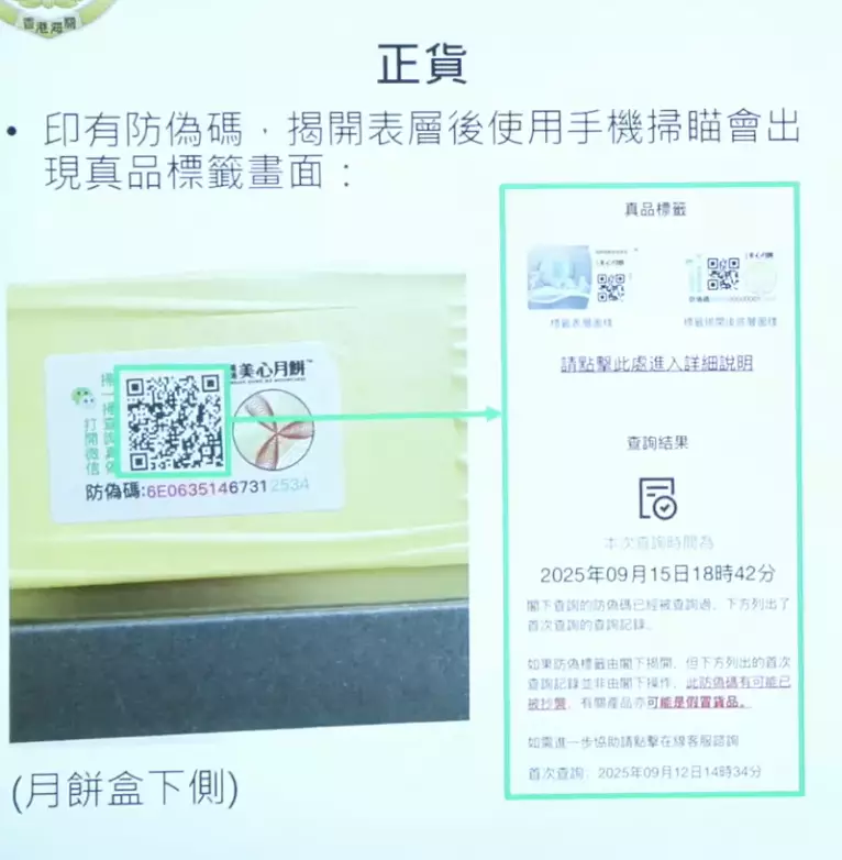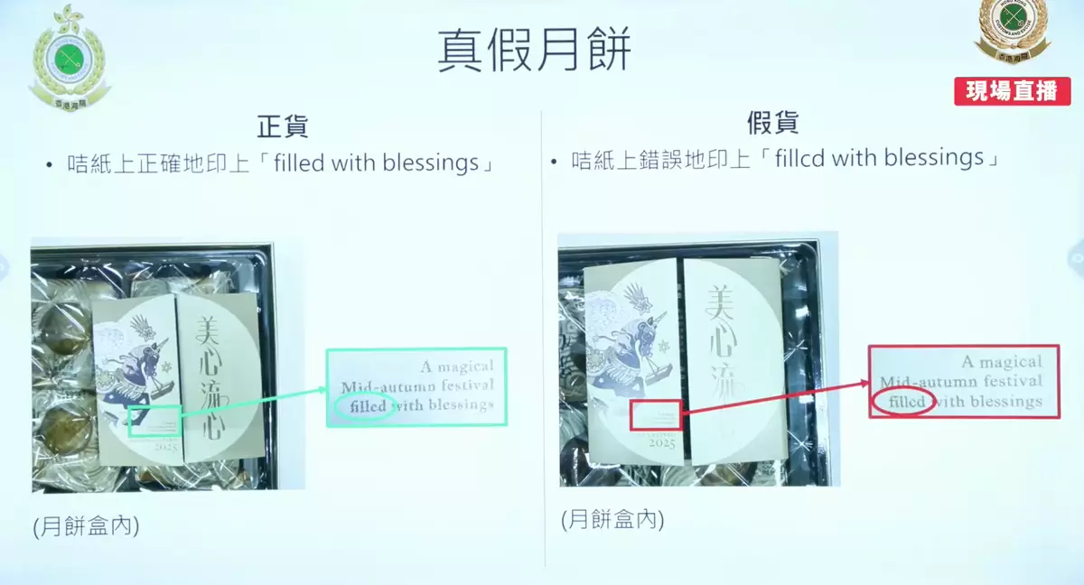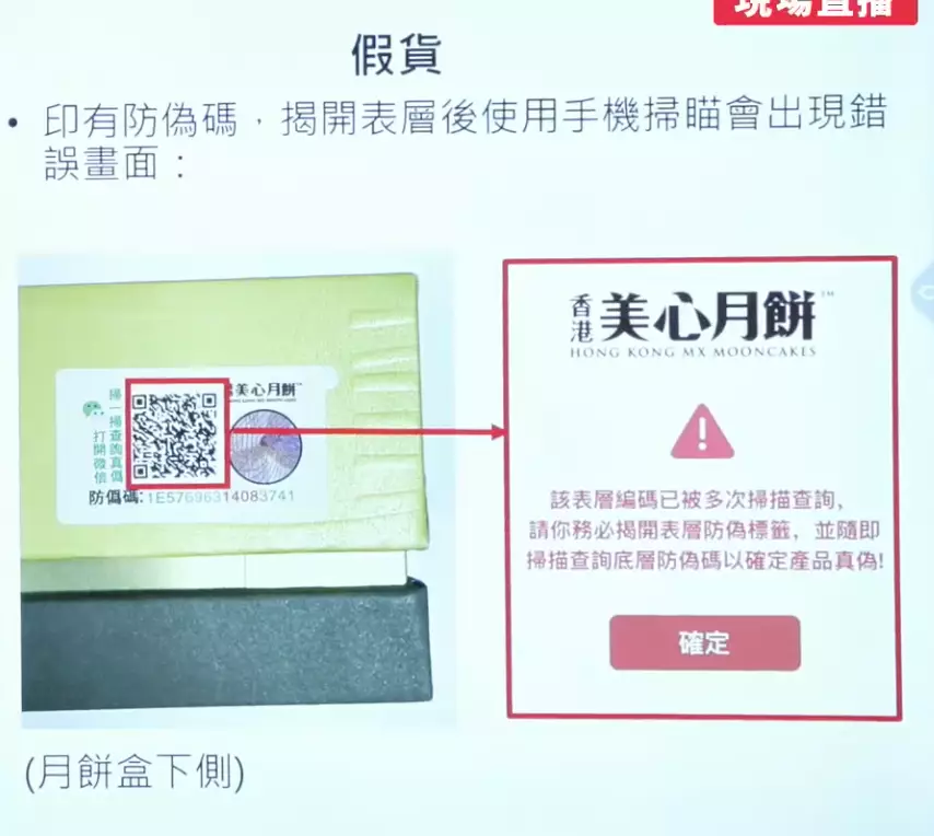 何又指,月餅盒的下側防偽碼掃描結果亦有所不同,正貨印有防偽碼、揭開表層後使用智能電話掃描會出現真品標籤畫面,會顯示日期及時間,亦有防偽圖文碼及防偽碼供公眾核對;但冒牌貨雖也印有防偽碼,但揭開表層後使用手機掃描會出現錯誤畫面。另外月餅盒內的卡紙亦有所不同,正貨卡紙上正確印上英文字句filled with Blessings,而冒牌貨卡紙上錯誤地將「filled」的「e」印成「c」,錯誤顯示為「fillcd」。