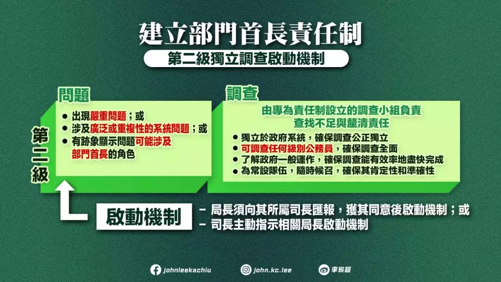 李家超表示,「部門首長責任制」調查機制按照問題大小輕重程度,將調查分為兩個級別處理,第一級若問題屬一般性質,調查由部門首長負責,查找不足,予以改善,並按照公務員管理制度對過失人員作出相應行政或紀律處理。第二級: 如部門出現嚴重問題,或涉及廣泛或重複性的系統問題,或有跡象顯示問題可能涉及部門首長的角色時,調查由專為責任制設立的調查小組負責,查找不足與釐清責任。該小組獨立於政府系統,以確保調查公正獨立;小組可調查任何級別公務員,確保調查全面;小組了解政府一般運作,確保調查能有效率地盡快完成;小組將為常設隊伍,隨時候召,確保其肯定性和準備性。