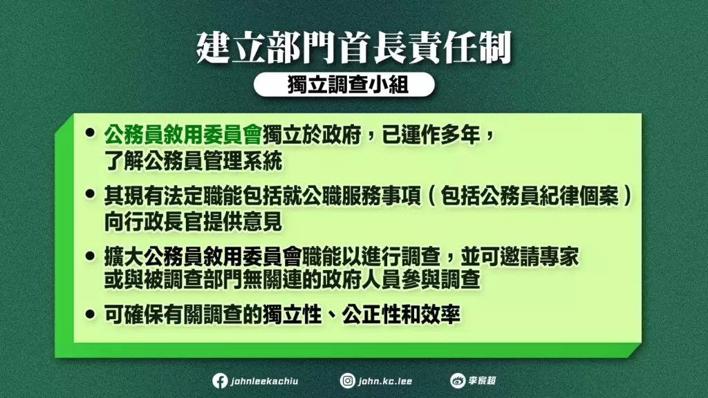 李家超表示,會擴大現時「公務員敍用委員會」的職能以進行調查。委員會獨立於政府,已運作多年,了解公務員管理系統;其現有法定職能包括就公職服務事項(包括公務員紀律個案)向行政長官提供意見。現時委員會的職務不涵蓋調查,擴大其職能以涵蓋調查,並可邀請專家或與被調查部門無關連的政府人員參與調查,既可確保有關調查的獨立性和公正性,亦可確保調查效率,並達致調查機制第二級的四點要求。