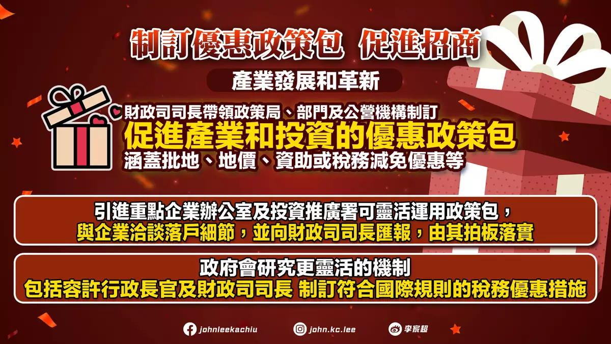 他表示,財政司司長會帶領相關政策局、部門及公營機構,制訂促進產業和投資的優惠政策包,涵蓋批地、地價、資助或稅務減免優惠等,吸引高增值產業和高潛力企業落戶香港,推動高質量發展。