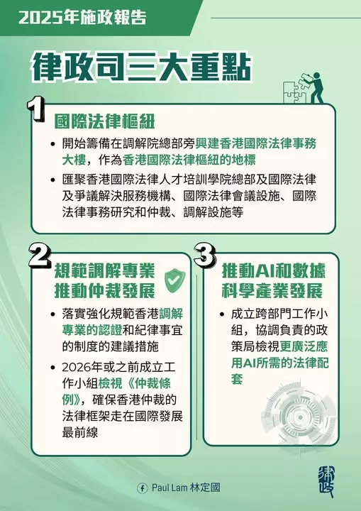 施政報告中提及律政司三大政策重點。林定國FB圖片