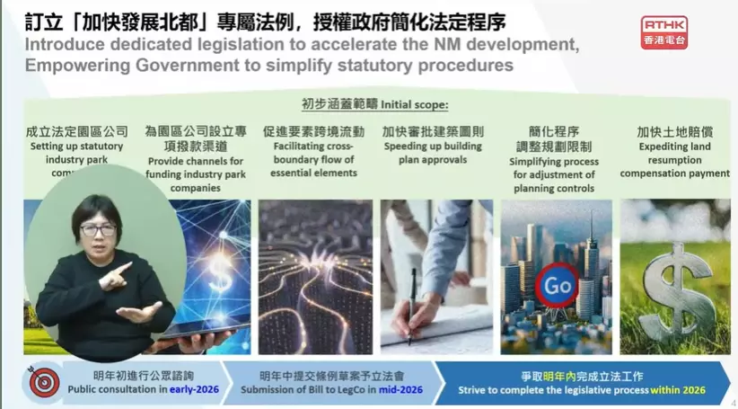 施政報告提出加快發展北部都會區,發展局局長甯漢豪表示,在北都將繼續推行多元開發模式,包括原址換地和「片區開發」等,而政府將於今年第四季推出洪水橋「片區」試點。