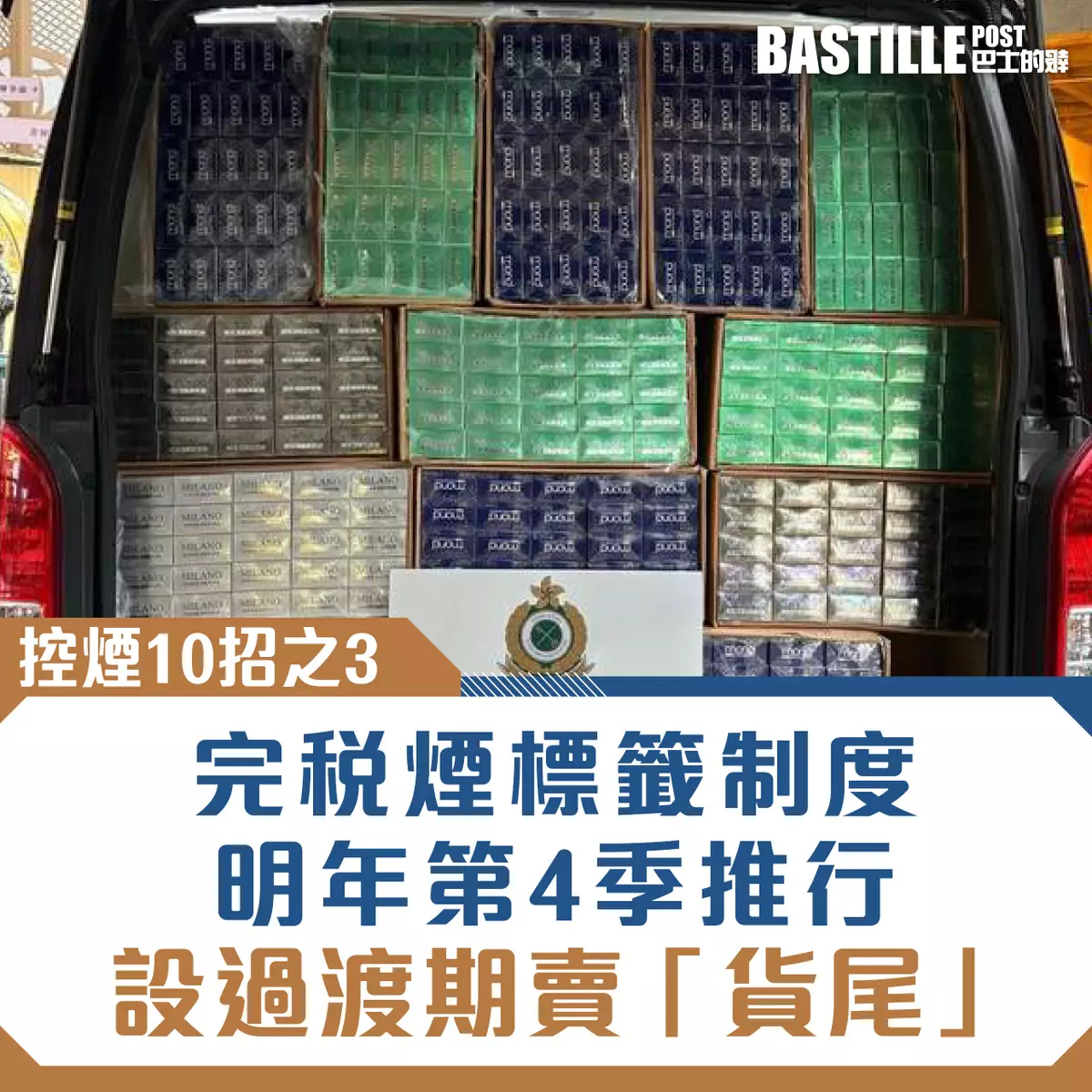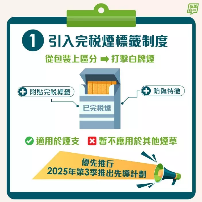 —自2026年第四季起,正式推行首階段法例,要求所有生產的完稅煙須有完稅標籤;同時設有過渡期,仍容許市面上沒有完稅標籤、但已課稅的「貨尾」產品繼續出售;