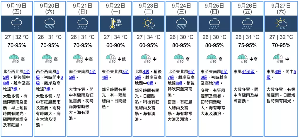 香港天文台表示,將於星期五早上9至11時之間改發3號強風信號。