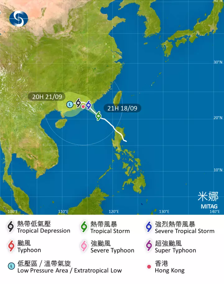 天文台指出,受華南的東北季候風與米娜的共同影響,星期四晚至星期五初時本港離岸海域及高地開始間中吹強風。預料米娜會逐漸增強,靠近廣東東部沿岸,天文台會在星期五早9時至11時之間改發3號強風信號。