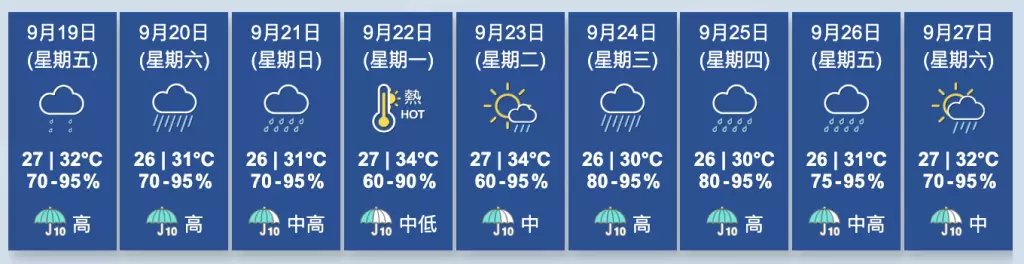 天文台說,受其廣闊環流影響,下週中期該區天氣顯著轉壞。風勢再度增強,有狂風大驟雨及雷暴,海有非常太浪及湧浪,由於屆時風暴潮可能較為顯著,沿岸地區或會出現水浸。