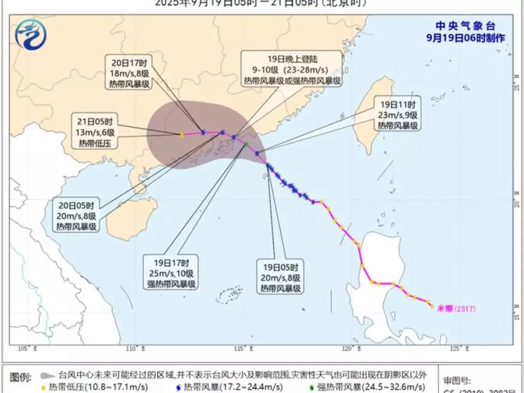 中央氣象台發佈颱風藍色預警和暴雨藍色預警,預計熱帶氣旋米娜星期五晚在廣東汕尾至台山一帶沿海登陸,登陸後向偏西方向移動,強度逐漸減弱。