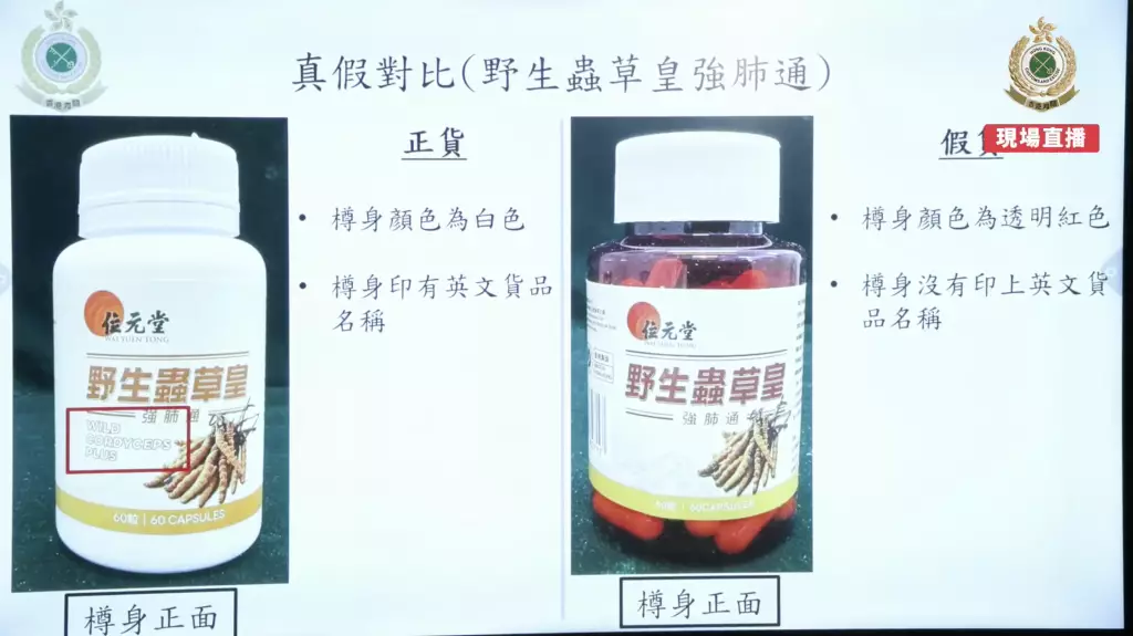 海關上周二突擊搜查一幢元朗工廈兩個單位,發現一批懷疑冒牌貨,當場拘捕四男三女,介乎24至57歲,其中兩人是涉案公司董事。其中懷疑冒牌健康食品的包裝、尺寸、樽身設計、藥丸顏色等都與正貨不同,成分不明,可能危害市民健康。海關已將樣本交予政府化驗所檢驗。