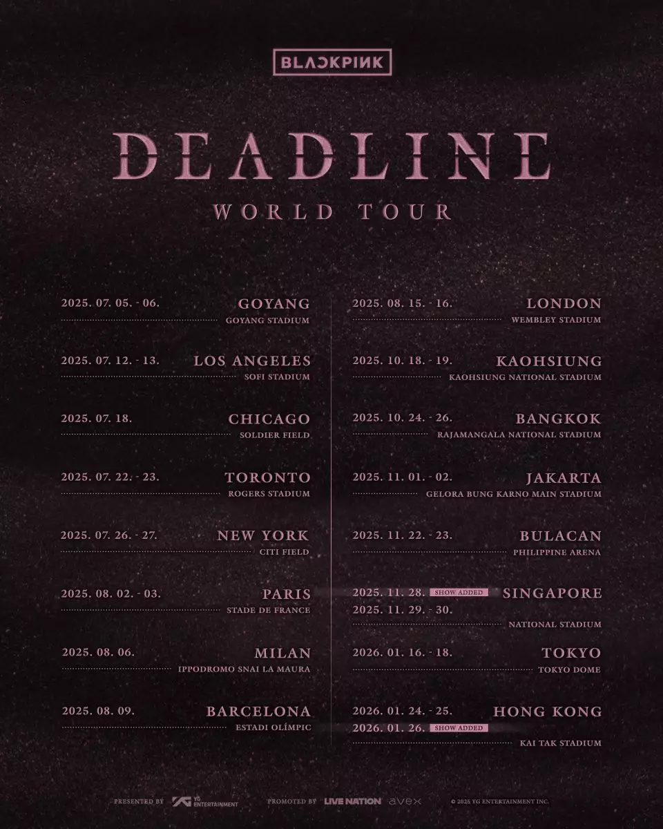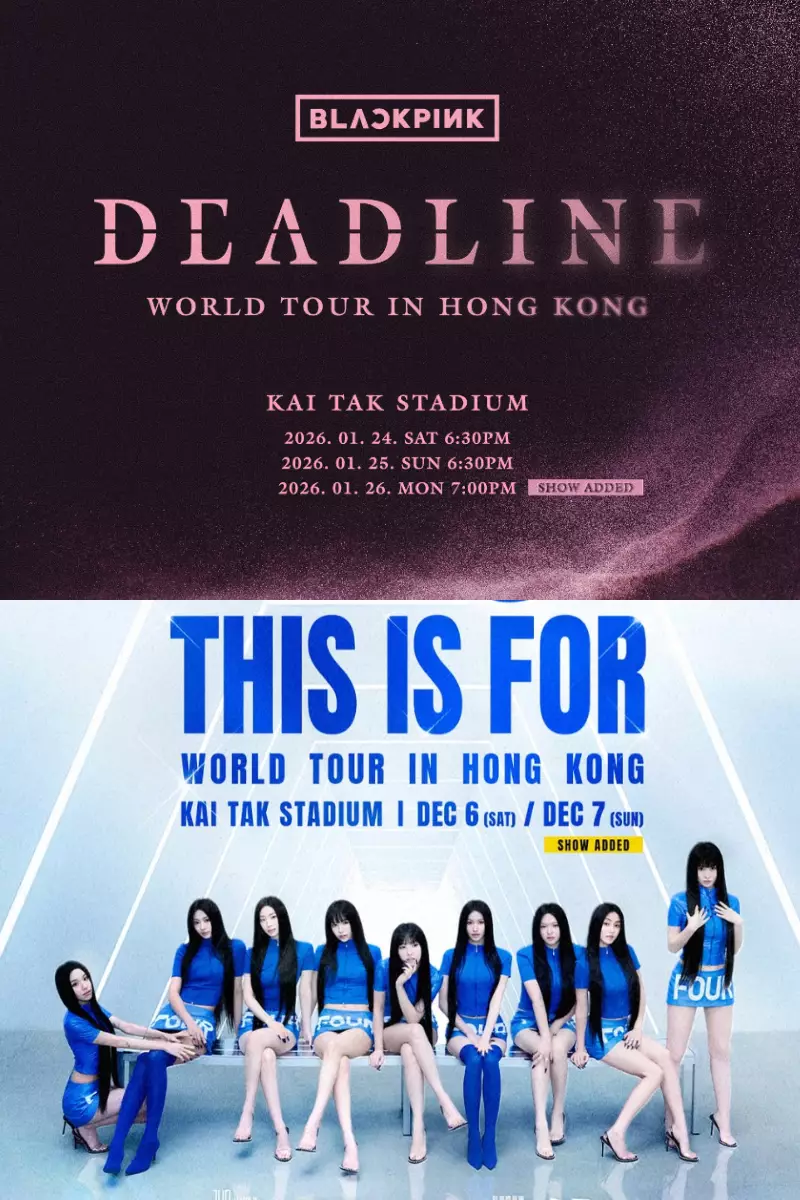K-POP熱潮持續席捲香港,韓流女子天團BLACKPINK與TWICE接連發布好消息,為樂迷帶來雙重驚喜。由於粉絲反應熱烈,BLACKPINK在9月19日正式宣布其世界巡迴演唱會《DEADLINE》香港站將加開第三場演出,預計將進一步點燃啟德體育園的熱血氛圍;與此同時,TWICE的《THIS IS FOR》世界巡演香港站亦確認加開一場,兩場門票於9月19日中午12時起在Cityline平台公開發售,樂迷需把握機會搶票!