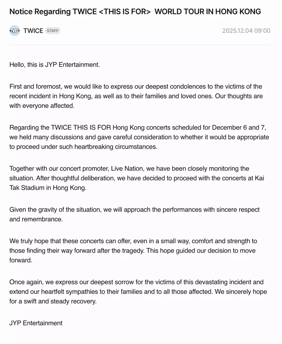 另一邊廂,TWICE的《THIS IS FOR》世界巡演香港站同樣收到粉絲熱烈回應,官方宣布加開一場12月7日(星期日)演出,與原定12月6日(星期六)場次並列兩天連演,兩場均於晚上6時在啟德體育園舉行,由Live Nation主辦,購票平台為Cityline。TWICE以甜美活力與精湛舞技著稱,此次巡演延續其全球巡迴熱潮,為ONCE(TWICE粉絲)帶來難忘回憶,加場門票將於9月19日星期五中午12時起公開發售,門票種類包括VIP套票2,499港元、站票1,799港元,以及座位票1,799、1,499、1,099、899、799港元不等。官方呼籲樂迷「記得準時搶飛」,以免錯過這場許願實現的盛會。兩團巡演的加開,不僅反映K-Pop在香港的火熱人氣,更預示啟德體育園將成為亞洲音樂重鎮,感興趣的粉絲宜及早準備,鎖定Cityline及相關平台!