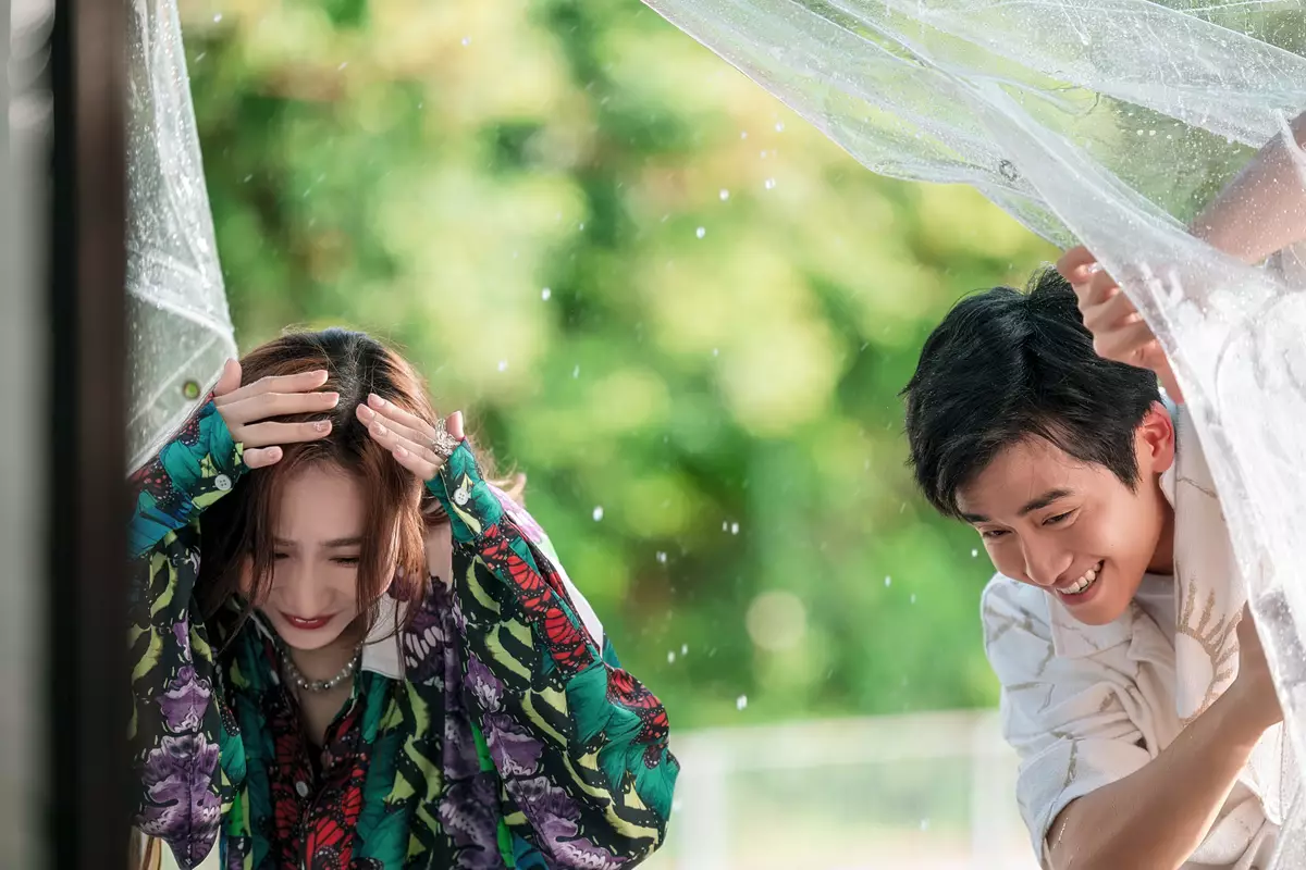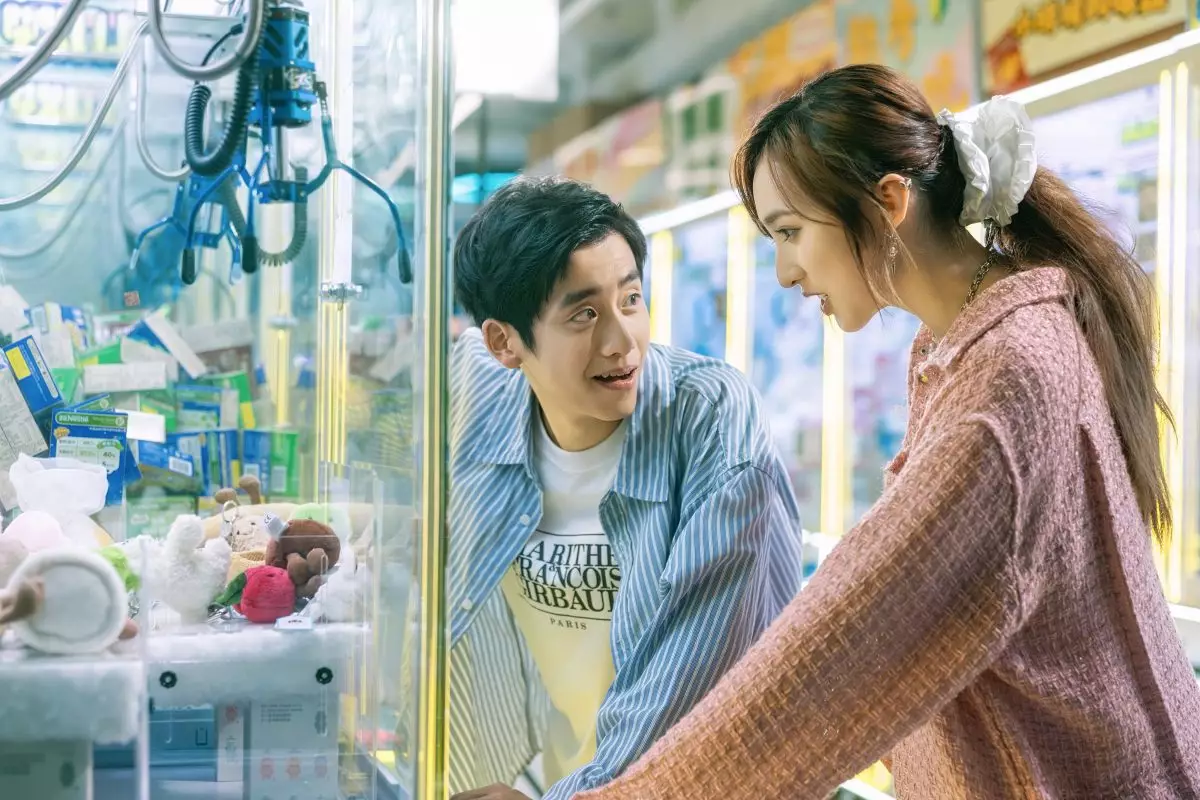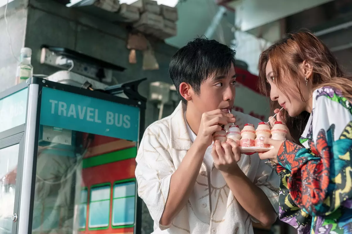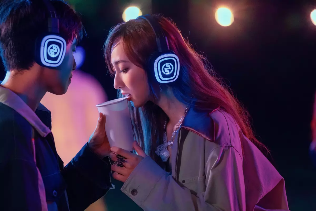 Yumi與男主角甜蜜互動頭貼頭喝飲品。