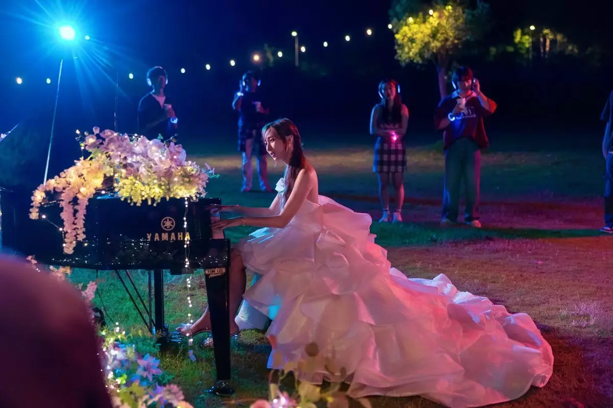 Yumi換上華麗晚裝坐在三角鋼琴面前自彈自唱。