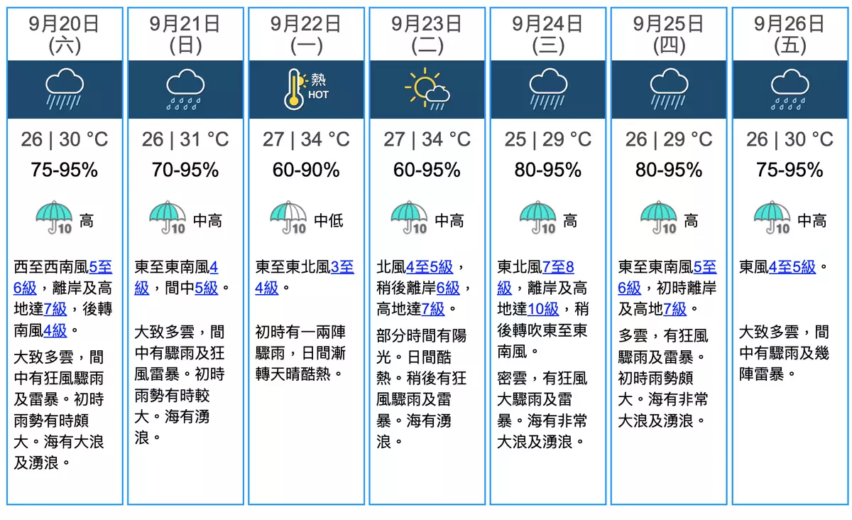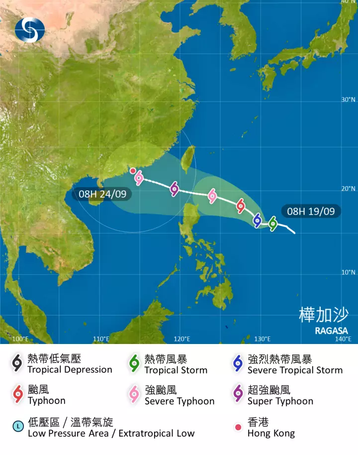 另一方面,天文台指熱帶風暴樺將在下周以超強颱風的威力進入南海北部,更再度調高預測9月24日的風力預測,指當日將吹東北風7至8級,離岸及高地達10級,即相當於8號、9號信號的風力。當日稍後會轉吹東至東南風。