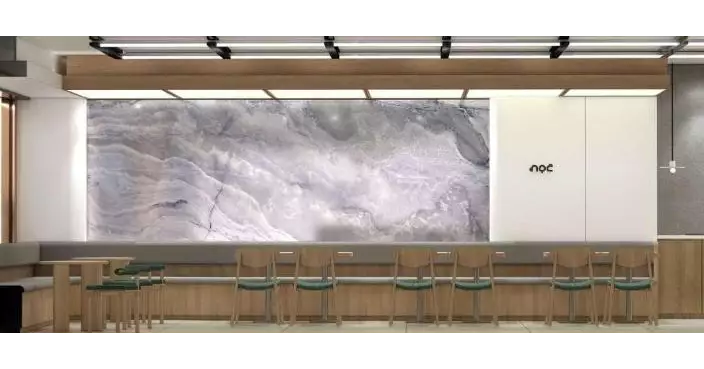 新店設計採用豐富的流線形圖案與溫暖的色調,靈感源自咖啡在杯中留下的自然紋理。最引人注目的咖啡吧和牆身位置以藝術漆演繹品牌全新的視覺元素,並融合了標誌性的 noc 灰與白。在咖啡吧空間,設計師巧妙運用鋁材和暖白燈管打造了前衛的格柵天花造型。此外,近7米長的特色燈箱以日式和紙及溫暖的木質材料製成,懸掛在主要的座位區上方,柔和的光線灑落,更添溫馨舒適之感。