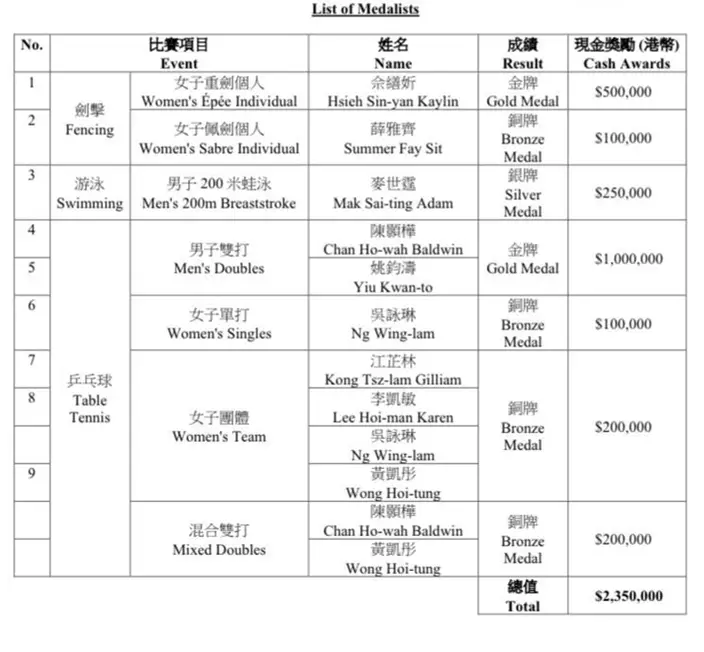 逾30名港隊運動員出席「賽馬會優秀運動員獎勵計劃」頒獎典禮,奪得獎牌的九位運動員獲頒支票。