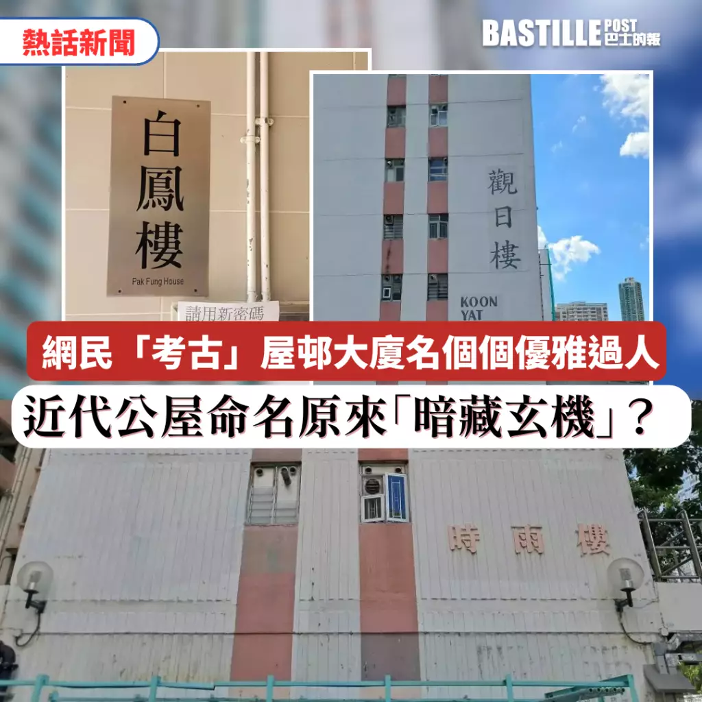 港人對公屋有獨特的情懷,一提到舊時屋邨,緊密的鄰里關係,舊式的房屋設計,這些都是香港珍貴的集體回憶。日前就有網民在社交平台發帖「考古」公共屋邨大廈的名稱,大讚以往屋邨名均相極富文采,至於近代屋邨名字反而欠缺誠意,不過有網友指出,近年來公屋的命名其實同樣「有料到」,暗藏玄機。